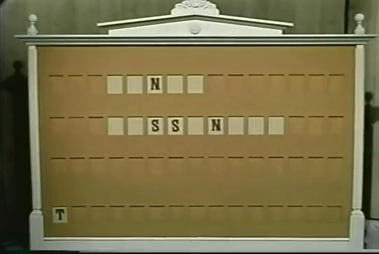 - The puzzle board is brown, with three rows of 15 spaces each and letters (in the Hopkins font, also used for the logo) revealed by pull-cards, with a staff member clearly visible behind it. A fourth row serves to denote letters that are called but not in the puzzle, referred to here as the "Wrong Letter Board" in lieu of an official name.